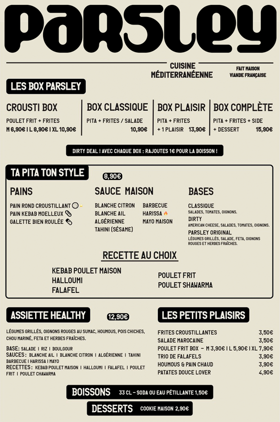 👉 Que ce soit sur place, à emporter ou en livraison (Uber Eats & Deliveroo), Parsley vous propose un kebab unique, préparé avec passion chaque jour.